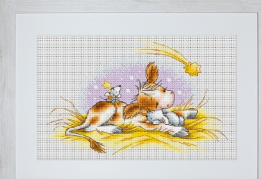 The ”A Christmas Story” counted cross stitch kit from Luca-S contains fabric for the work, cotton floss Anchor & thread sorter, a needle for embroidery, an instruction and a chart. Frame is not included.