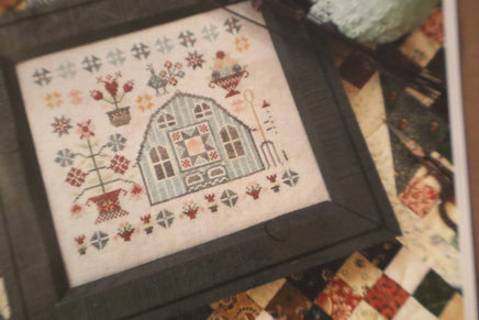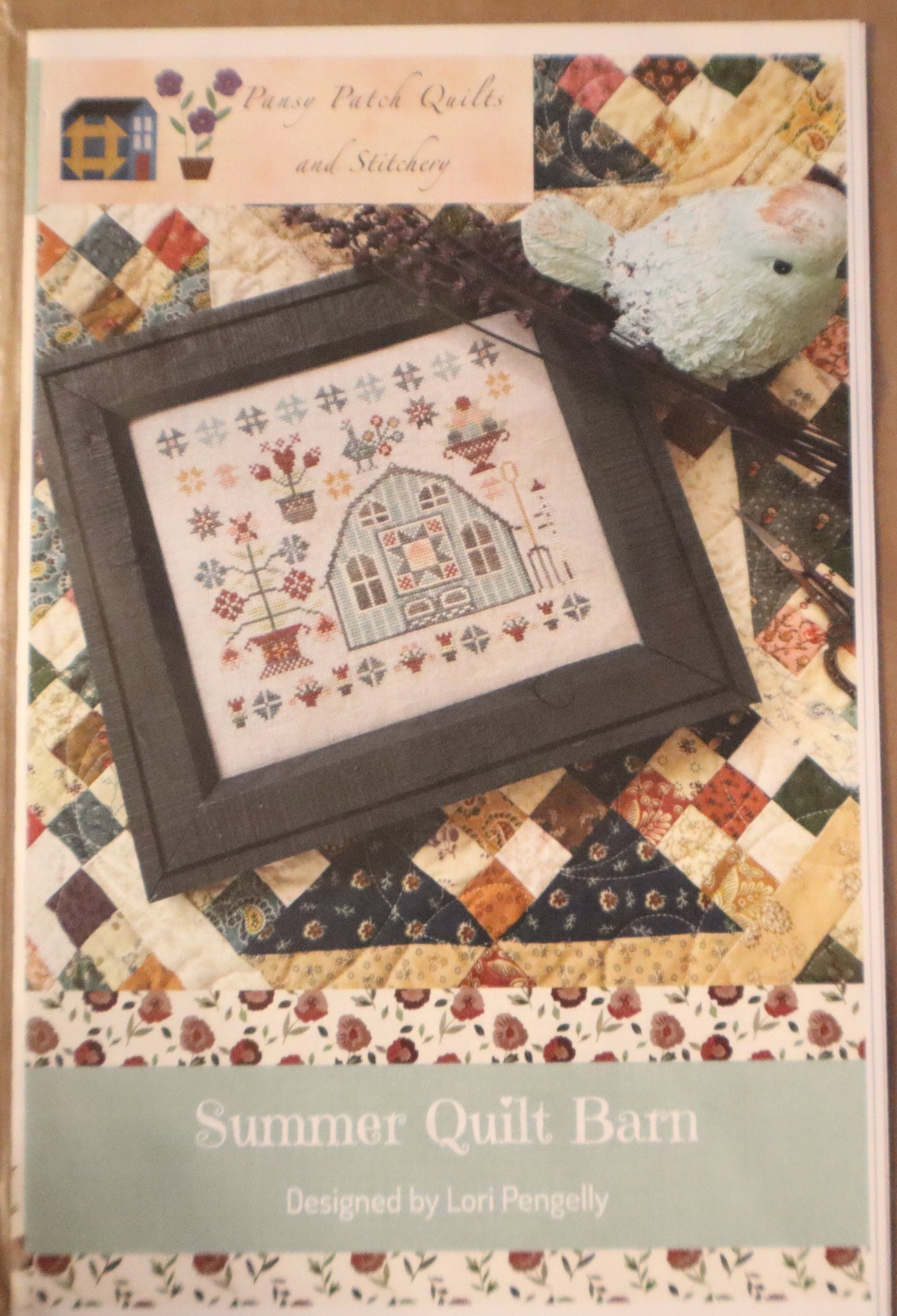 Cross stitch pattern from Pansy Patch Quilts and Stitchery featuring a sweet summer barn with bright colors and floral motifs.