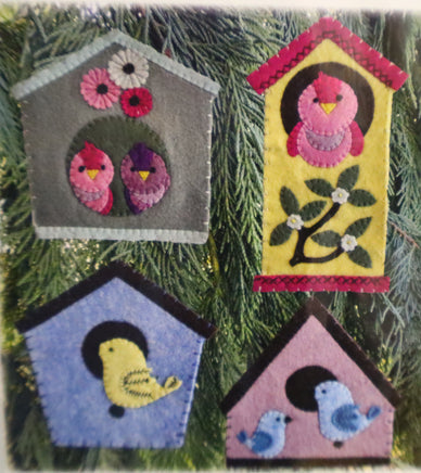A collection of four bird houses. Suitable for trimming the tree, gift giving or as a Spring decorating touch.