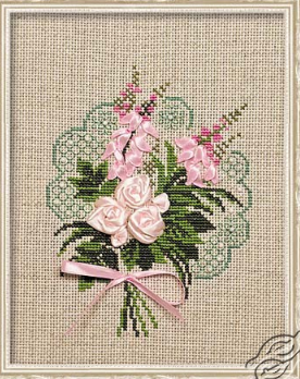 The ”Bouquet With Ribbons II” counted cross stitch kit from RIOLIS contains fabric for the work, thread & thread sorter, a needle for embroidery, a needle for beading, beads, ribbons (2 colours), an instruction and a chart. Frame is not included.