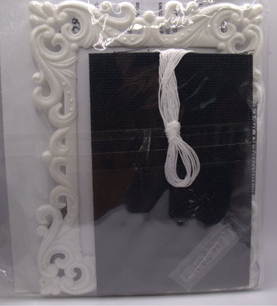 Kit Contains Plastic Frame - 14 ct. black Aida, embroidery Floss, needle and instructions