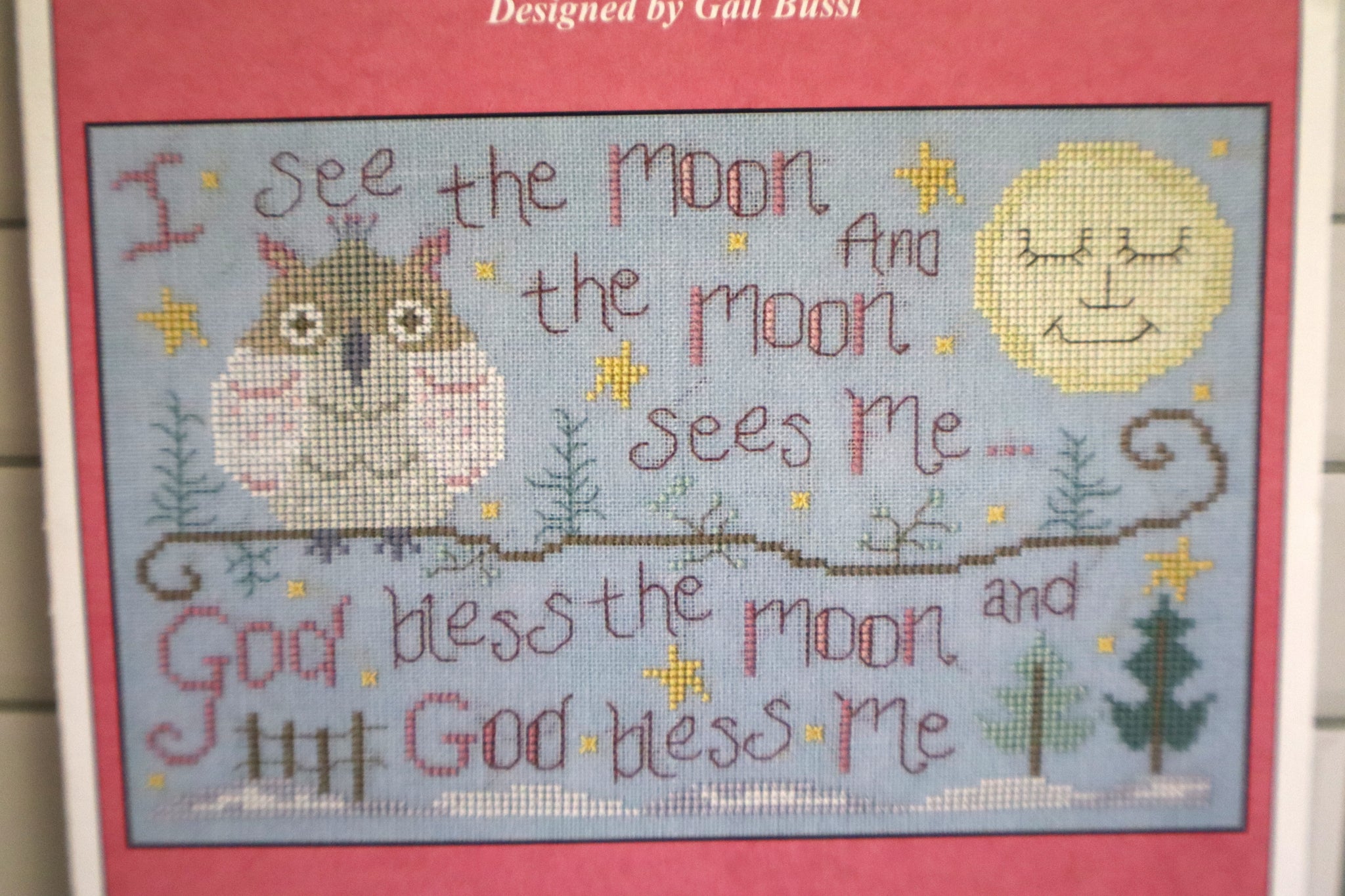 Cross stitch pattern from Imaginating featuring an owl with the phrase "I see the moon and the moon sees me...God bless the moon and God bless me"!