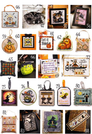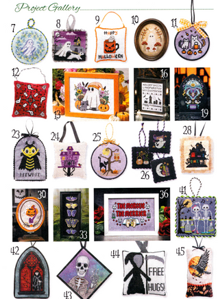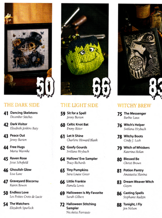 45 Halloween themed cross stitch designs. You'll find five chapters of patterns from your favorite designers, from playful lighthearted patterns to eerie spine-chilling creations.