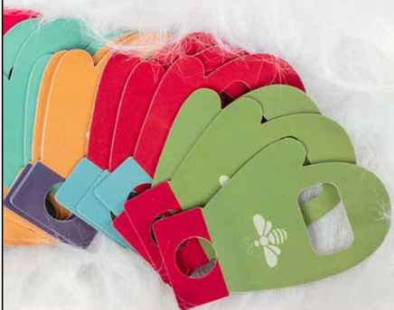 Cozy Mittens Floss Drops (aka bobbins, keys, tabs), pack of 24. Shaped like little mittens, these Drops have a hole in the cuff for an organizer ring and a opening in the mitten area for your floss. Fun for the holiday season