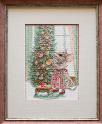 Celebrate the festive season with the A1026 Merry Mouse Cross-Stitch Kit. This delightful design shows a sweet mouse in a floral dress, carefully hanging ornaments on a sparkling Christmas tree. With its warm colors and charming details, this kit beautifully captures the joy and wonder of holiday decorating.