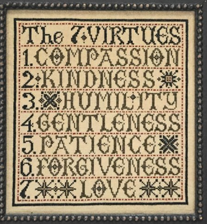 "The 7 Virtues - Compassion, Kindness, Humility, Gentleness, Patience, Forgiveness, Love" Model stitched on 30 Ct. Straw linen using Needlepoint Silks (or DMC 310, 3857, 535, 3032). Stitch Count: 141W x 153H.
