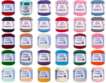 Aunt Lydia's-Crochet Cotton. This high luster mercerized cotton crochet thread is perfect for crochet projects both large and small. This thread is available in a wide range of fashion solids, neutral basics and alluring multi-colors that are ideal for home decorating and fashion projects.